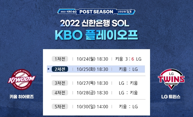 요키시는 정규리그 LG전 4번의 등판 기록도 성공적이었다. 좌완 투수인 그는 좌타자가 많은 LG에 효과적인 선발 투수다. LG 선발 투수 플럿코는 정규리그에서 15승을 기록하는 등 정상급 선발 투수로 활약했지만, 부상으로 긴 경기 공백이 있었다. 힘은 있지만, 경기 감각의 문제가 발생할 수 있다. LG가 불펜을 초반부터 일찍 가동할 가능성도 있다. 키움이 선취 득점으로 경기 흐름을 먼저 주도해야 한다. 1차전처럼 선취 득점을 내준다면 다시 끌려가는 경기를 할 수밖에 없다.