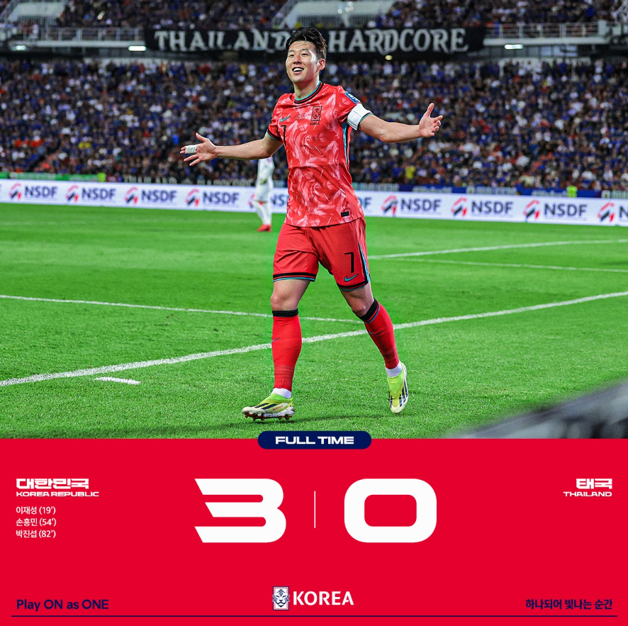 대표팀은 후반전 들어 무더운 현지 날씨 등을 고려해 적절한 선수 교체로 체력적 안배를 하며 경기를 안정적으로 이끌었다. 이를 통해 경기 페이스를 늦추지 않고 흐름을 주도할 수 있었다. 태국은 만회골을 위해 온 힘을 다했지만, 소진된 에너지는 몸이 따르지 않는 장면이 이어졌다. 결국, 대표팀은 남은 시간을 잘 관리하며 승리를 확정했다. 어떻게 보면 홈경기에서 나와야 할 스코어가 원정 경기에서 나온 셈이었다. 분명 양 팀의 전력차는 분명했다.